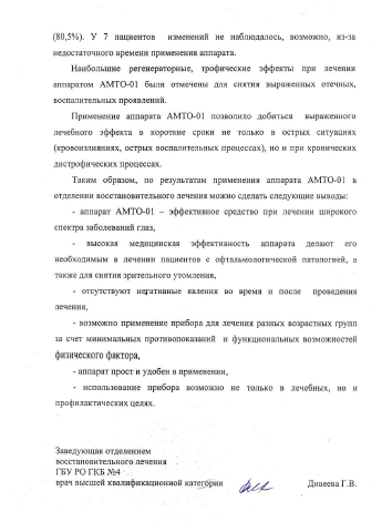 Дивеева Г.В., заведующая отделением восстановительного лечения ГБУ РО ГКБ №4 врач высшей квалификационной категории. "Применение аппарата АМТО-01 позволило добиться выраженного лечебного эффекта в короткие сроки не только в острых ситуациях (кровоизлияниях, острых воспалительных процессах), но и при хронических дистрофических процессах..." |