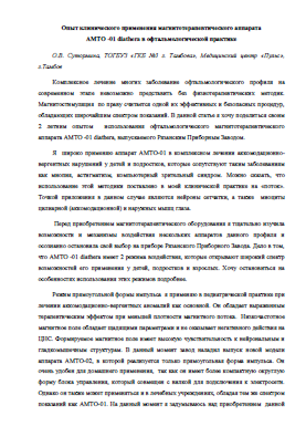 О.В. Сутормина, ТОГБУЗ «ГКБ №3 г. Тамбова», Медицинский центр «Пульс», г.Тамбов "Перед приобретением магнитотерапевтического оборудования я тщательно изучила возможности и механизмы воздействия нескольких аппаратов данного профиля и осознанно остановила свой выбор на приборе Рязанского Приборного Завода. Дело в том, что АМТО-01 diathera имеет 2 режима воздействия, которые открывают широкий спектр возможностей его применения у детей, подростков и взрослых..." |