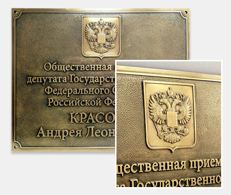 Мы изготавливаем таблички и вывески для оформления офисов, входных групп и домов. Табличка может быть выполнена аппликацией на пластиковой основе, с использованием фотопечати или из латуни.